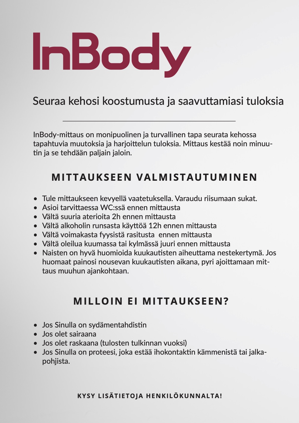 Saat aina perustiedot tulosten tulkinnasta henkilökunnaltamme, mutta voit lukea lisää myösInBodyn omalla tulosten tulkintasivulla!